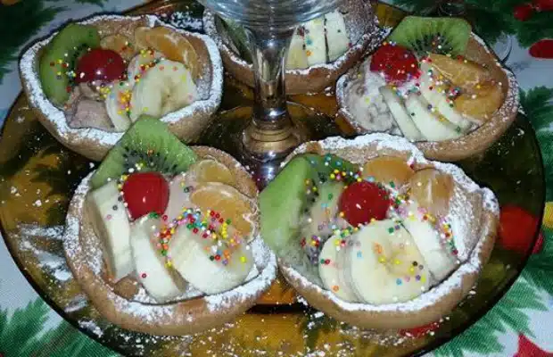 Правят се кръгчета или цветенца с формички. Поставят се на обратната страна на форма за мъфини и се пекат на 180 градуса. След като изтинат се поръсват с пудра захар и се пълнят с плодове по ваш избор!
