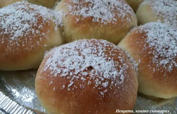 Затопляме печката на 180°С и печем в продължение на 20 минути до зачервяване на поничките. Поднасят се топли поръсени с пудра захар или намазани с масло.