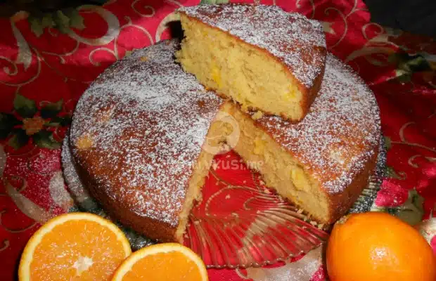 Когато всичко се смеси добре, изсипете сместа в голяма намаслена тава и печете в предварително загрята умерена фурна. След готовност извадете тавата и покрийте с кърпа, като оставите 15 минути без да го изваждате. Поръсете с пудра захар преди консумация.