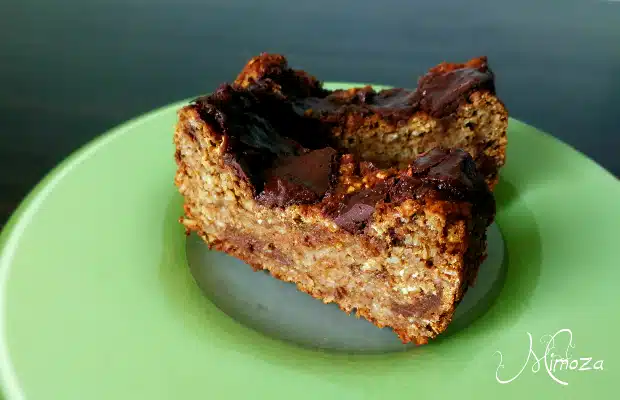 Всичко се разбърква много добре и се изсипва в застлана с хартия за печене продълговата форма за кекс (дължина 20-25 см). Сладкиша се поръсва с останалия шоколад и се пече в предварително загрята на 180 градуса фурна за 35-40 минути.