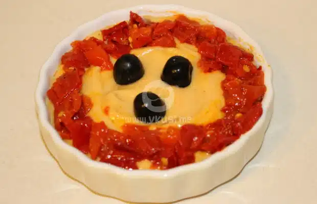 Поднасяме, като върху пюрето подреждаме маслините и нарязаните чушки. За финал слагаме няколко капки зехтин допълнително.