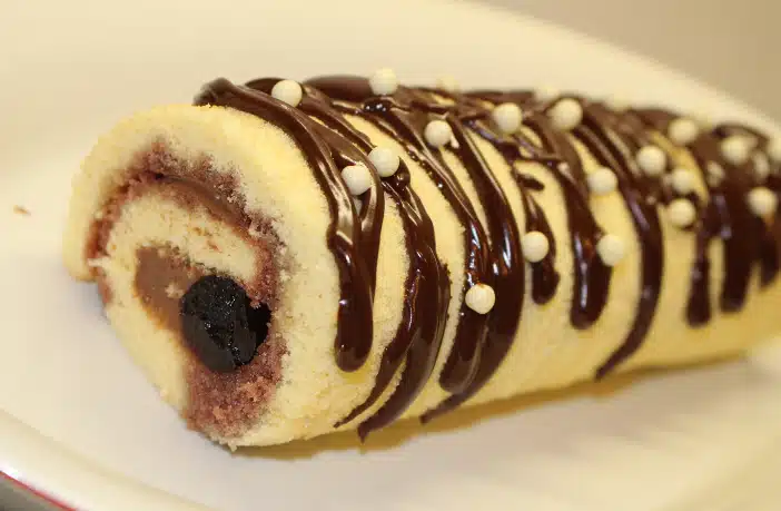 След като изстине, напояваме с ликьора. В единия край намазваме с крема филаделфия, а в останала част със сладкото. Завиваме и оставяме за около 2 часа.
