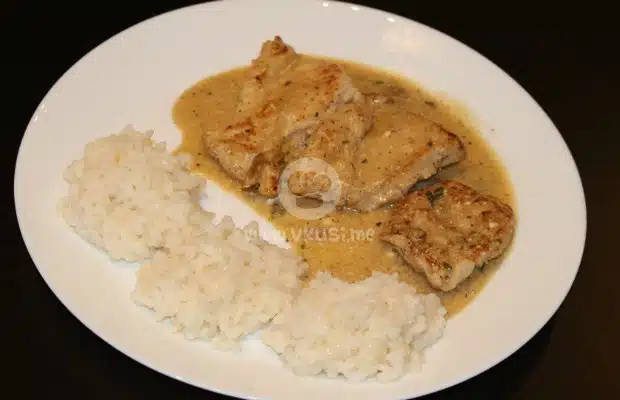 Изваждаме филенцата и в същия тиган запържваме нарязаните лук и чесън. Прибавяме малко зехтин и в същия тиган запържваме брашното за кратко. Разреждаме соса с готварската сметана и малко топла вода.