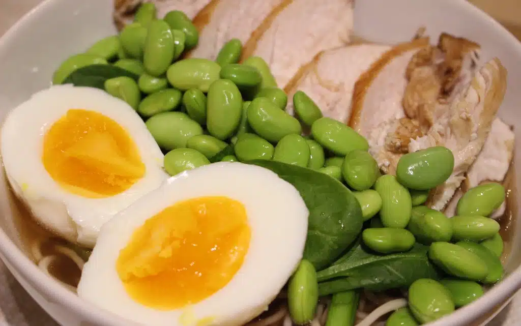 Поднасяме супата гореща, като в дълбока купичка или супена чиния поставяме от нудлите. Заливаме ги с прецеден бульон. Отгоре подреждаме резени месо, спанак, разполовено яйце и малко едамаме. Поръсваме с нарязан на едро зелен лук.
