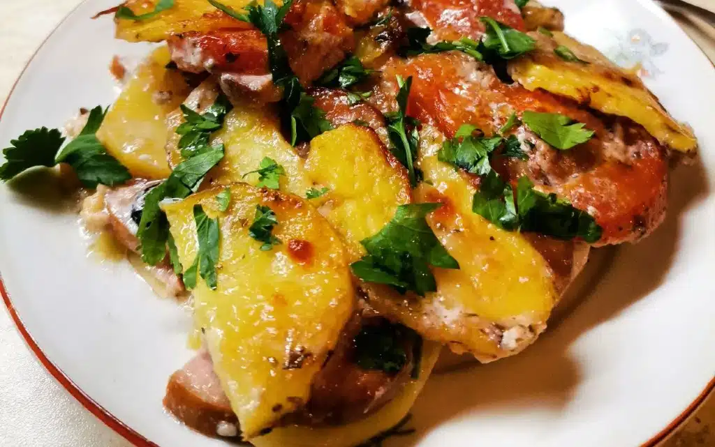 В тавичка започваме да редим първо картофи, сол, наденица, маслини, кашкавал, риган и пак картофи, наденица, домати, кашкавал, риган, докато не свършват продуктите. Накрая заливаме с течна сметана и покриваме тавата с фолио.