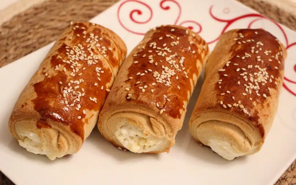 Разделяме тестото на две и всяка половина разточваме на тънка правоъгълна кора. В единия край на всяка кора поставяме натрошено сирене, което сме смесили с белтъка на второто яйце и завиваме на руло.