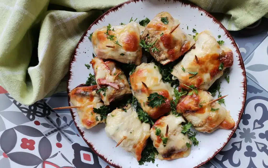 След като изстине, намазваме патладжана със сиренето и слагаме по едно саламче. Завиваме на руло и слагаме клечка за зъби.