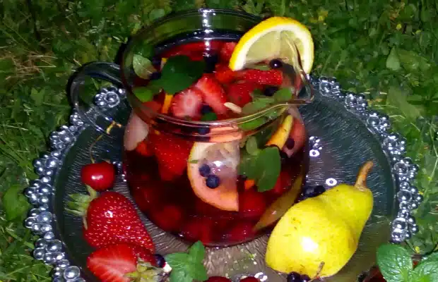 Измийте добре всички плодове. Нарежете ягодите наполовина по дължина, черешите обезкостете, крушата нарежете на парчета, а лимонът – на полумесеци. Накъсайте листенцата мента. Сипете всички плодове в голяма кана и полейте с ягодовия ликьор. Оставете в хладилник за 30 мин.