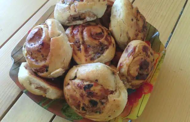 Получава се дълго руло. Режа го на равни части. Рулцата трябва да са с големина 6 см. В тавата на фурната слагам хартия за печене. Нарязаните рулца ги нареждам на разстояние едно до друго, като ги сплесквам леко /както е на снимката/.