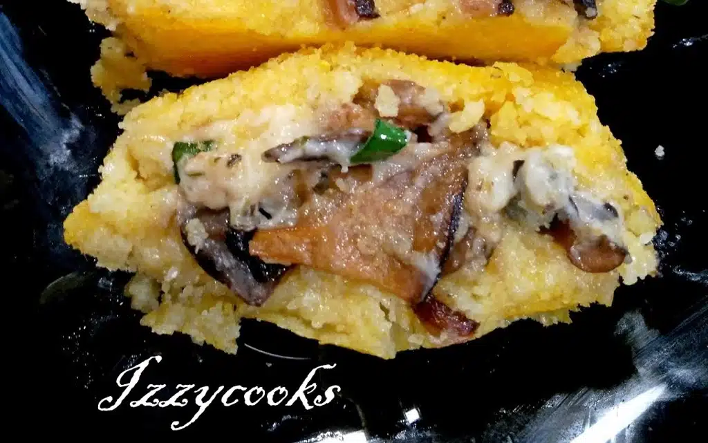 Разпределяме качамака на тънък слой върху стреч фолио. Отгоре разпределяме плънката и завиваме на руло. Поливаме с останалите 2 с.л. масло и поръсваме с царевично брашно. Запичаме до златисто на 200 градуса.