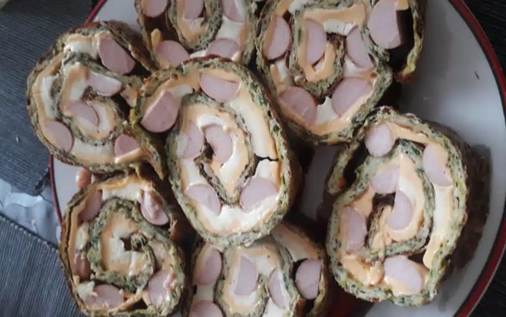 Когато блатът от тиквички е готов, намазваме обилно с крема сиренето, редим резенчета топено сирене, кренвирши или друго, което обичате. Завиваме на руло и оставяме за малко в хладилник, за да стегне.