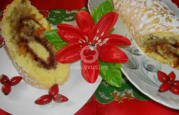 Печем в загрята фурна 180 градуса за 15-20 минути (или до суха клечка). Изважда се блата и се обръща върху нов лист хартия, махаме хартията отгоре и намазваме сладкото, навива се на руло.