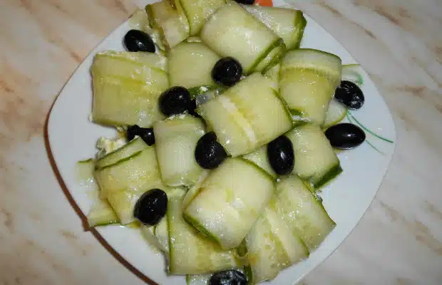 Краставицата се разрязва надлъжно точно по средата. С белачка се правят дълги и тънки ленти от вътрешността на краставицата. Изварата се смесва с майонезата, пресования чесън, надробените жълтъци и се разбърква добре. Прибавя се и малко сол и зехтин. В началото на всяка лента от краставица се слага по малко от сместа и се навиват на рулца. Нареждат се в чиния и се декорират с маслини, може да се полеят с малко зехтин.
