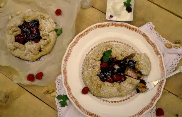 След като тестото се охлади се разделя на четири. Разточват се върху леко набрашнена повърхност с дебелина около 3-4 мм. Плодовете се разпределят в средата на тарталетите. Оставя се непокрито тесто. Краищата се загъват навътре.