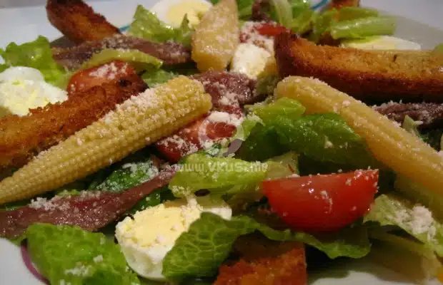 Изсипва се и дресинга. Разбърква се много добре. Продуктите се разпределят в две чинии за сервиране. След което се прибавят и нарязаните на половинки пъдпъдъчи яйца, мини царевичките, аншоата, печените филийки и пармезана.