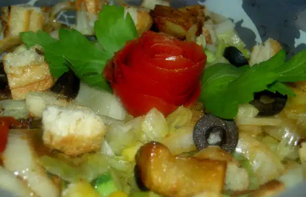 Филийките хляб се нарязват на малки кубчета, които се наръсват с чесън на прах и се запичат в тефлонов тиган. Готовите крутони слагаме най-отгоре на салатата.