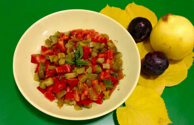 Киселите краставици и доматите се нарязват на много ситно. Чушките се белят и почистват от семките и се нарязват също на ситно.