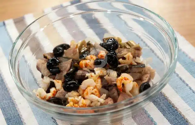 Нарязвате чушката и лука. Смесвате ги в купа и добавяте парченцата пушена скумрия, маслините и месото от раци.