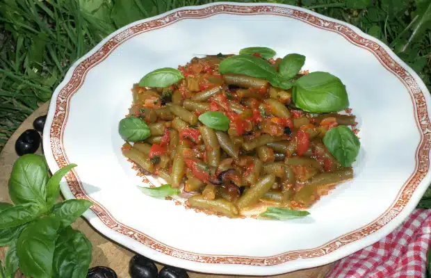 Нарежете лука и чесъна на ситно и ги задушете в зехтина. Когато омекнат, прибавете захарта и оставете да се карамелизират. Добавете оцетът и оставете да поври за около минута. Накрая добавете доматите на кубчета и накълцаните на дребно маслини. Подправете със сол, черен пипер на вкус и нарязан на ситно босилек. Разбъркайте много добре и оставете да покъкри на слаб огън няколко минути. Накрая добавете зеления фасул и разбъркайте салатата много добре. Сервира се охладена и с цели листенца пресен босилек.
