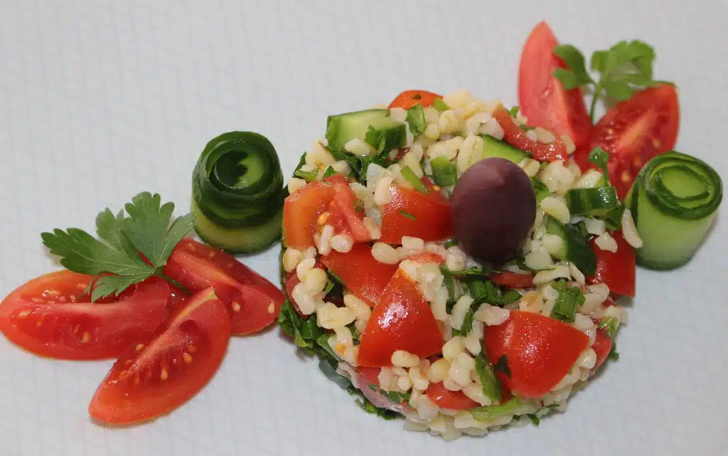 Сваряваме булгура в съотношение 1:3 за около 15 минути. Изцеждаме добре и оставяме в съд с капак, докато се охлади напълно. Нарязваме зеленчуците на ситно. Объркваме всичко в дълбока купа, овкусяваме със сол, лимонов сок и зехтин и поднасяме самостоятелно или като гарнитура.