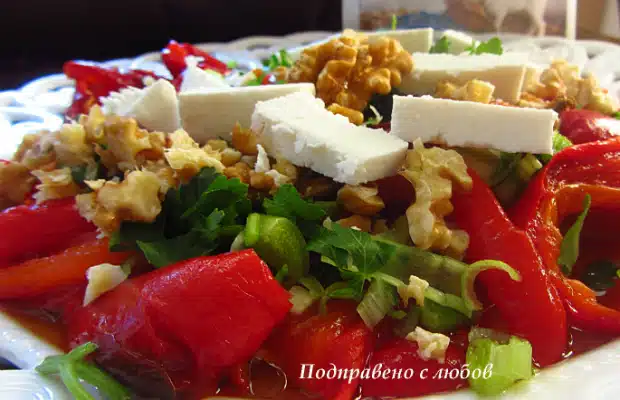 Салатата с ароматни и сочни печени чушки е класика за летния сезон. Не бих могла да устоя на аромата им – завръщане в щурото детство. Опитайте да обогатите тази салата с козе сирене и орехи и ще останете очаровани. За по интензивен аромат и вкус, бихте могли да запечете ядките за кратко на сух тиган. Да ви е сладко!