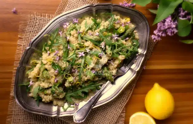 В купа смесете киноата с аспержите. Овкусете ги със зехтина, лимоновия сок, копъра, солта и лимоновата кора. Разбъркайте добре.
