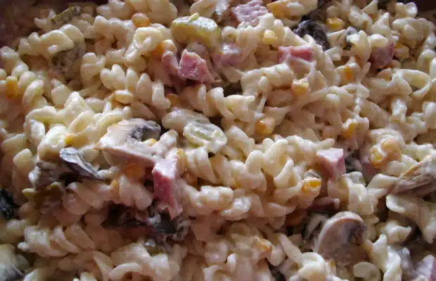 Макароните се сваряват и се смесват с останалите продукти, като краставичките, маслините, рулцата и салама се нарязват на малки кубчета. Оставя се за 30 минути в хладилник.