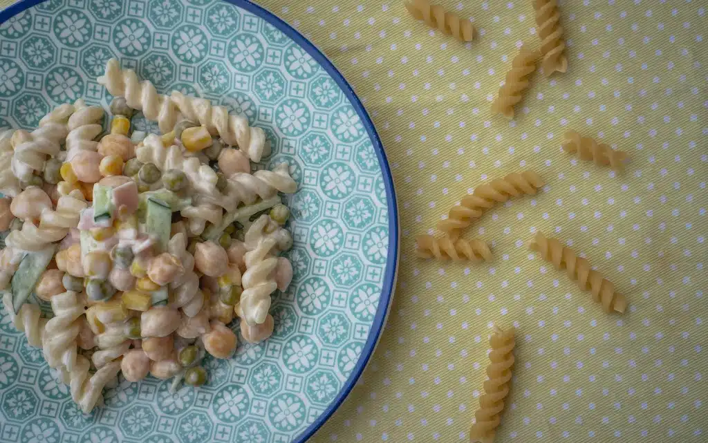 Фусилите се сваряват в подсолена вода, след което се отцеждат. Краставицата и шунката се нарязват на малки ивички и се поставят в голяма купа. Към тях се добавят фусилите, граха, царевицата, нахута и майонезата. Всичко се разбърква добре и овкусява със сол.