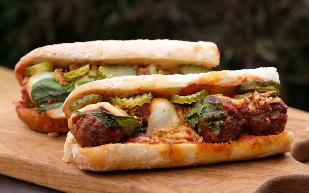 Нарежете багетата на парчета с дължина 25-30 см. Разрежете всяко парче на две и намажете отвътре двете страни с масло. Сложете 4 кюфтенца и доматен сос. Отгоре подредете тънки филии пушена моцарела и 2-3 листа босилек по желание. Притиснете добре и увийте всеки сандвич в алуминиево фолио. Поставете върху скарата на силен огън и печете 5-8 минути, като обръщате сандвичите на всеки 1-2 минути.