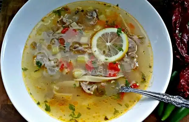 При поднасяне сипете супата в дълбока чиния или купичка, сложете резен лимон и за почитателите на пикантното – поръсете с щипка лют пипер люспи.