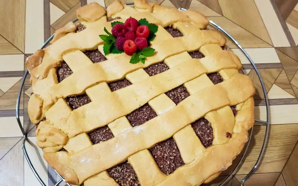 Завършваме с дълги ленти около 1,5 см ширина, направени от втората част на тестото и ги слагаме върху мармалада и орехите. Печем на предварително загрята фурна на 180 градуса до златиста коричка.
