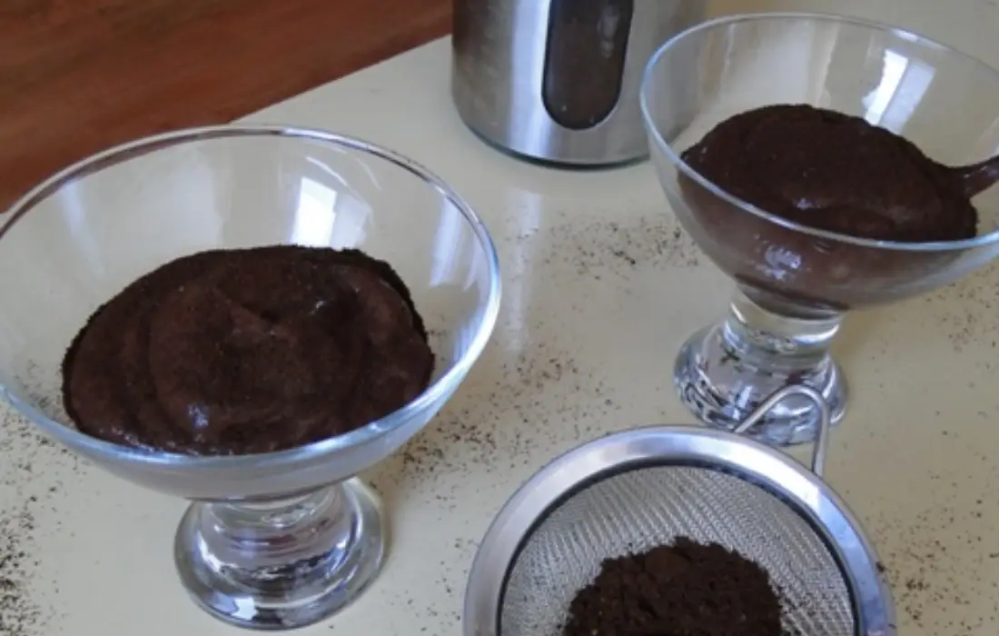 Готовият шоколадов мус с кафе се поднася охладен, поръсен със смляно кафе.