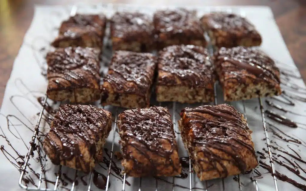 Оставете хляба да изстине 10 минути в тавата. Поръсете с какао и разтопен шоколад.