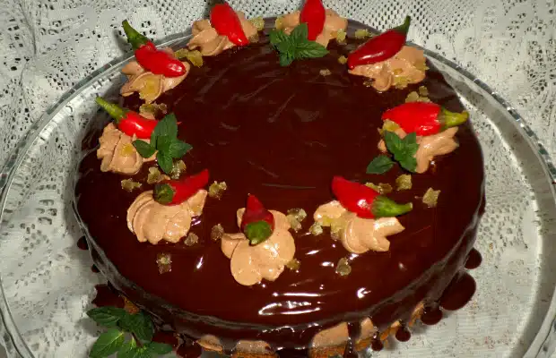 Пригответе глазурата, като разтопите шоколада на водна баня. Добавете лютия пипер, разбъркайте добре и на тънка струйка сипете олио, колкото да стане достатъчно течен, за да се разлее добре. Полейте тортата отгоре и нека се стече по стените, като го размажете леко с опакото на лъжица. Охладете за малко и украсете с розички от останалия крем и поръсете с още малко джинджифил. За закачка добавете и малки люти чушлета, които не е задължително да ядете след това или просто ги направете от захарно тесто.