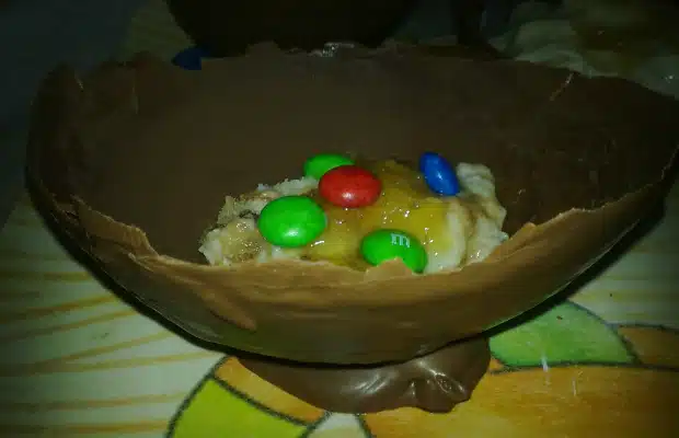 Кошничките се оформят от разтопен на водна баня шоколад, като с помощта на четка се нанася тънък слой шоколад върху вътрешните стени на формички по избор, най-добре силиконови.