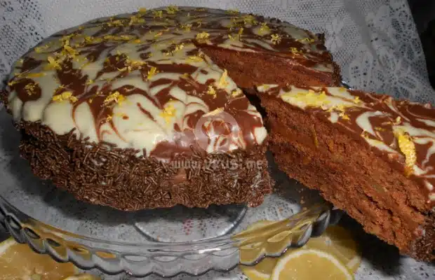 Полейте обилно тортата с натуралния шоколад. Разсипете белия шоколад на няколко места и с клечка за зъби леко размажете, за да се получат фигурки. Отстрани посипвате тортата с шоколадовите пръчици, а отгоре посипвате лимоновата кора. Прибирате на хладно, за да се стегне.