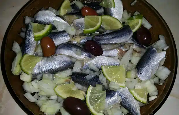 Лукът се нарязва на ситно, слага се в чиния, отгоре се слагат маринованите рибки заедно с маринатата в която са били, полива се със зехтин, сока на лайма добавят се парченца от него, слага се щипка пипер, разбърква се и се слагат няколко маслинки за разкош.