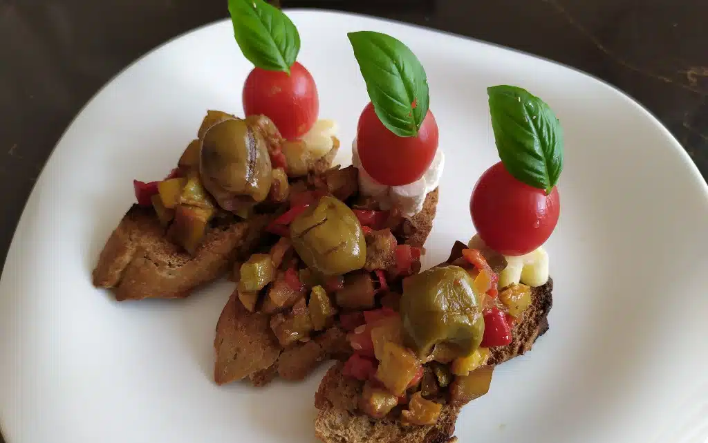 Днес моят избор е едно много семпло и лесно за приготвяне ястие, което се сервира като основно или върху брускета като предястие, приготвено с любимите на местните – патладжани.