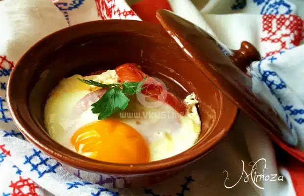 Гювечето се похлупва и се слага в студена фурна. Пече се на 180’С за 15 минути. След което се изважда, чуква се отгоре яйцето, похлупва се и се пече още 15-20 минути.