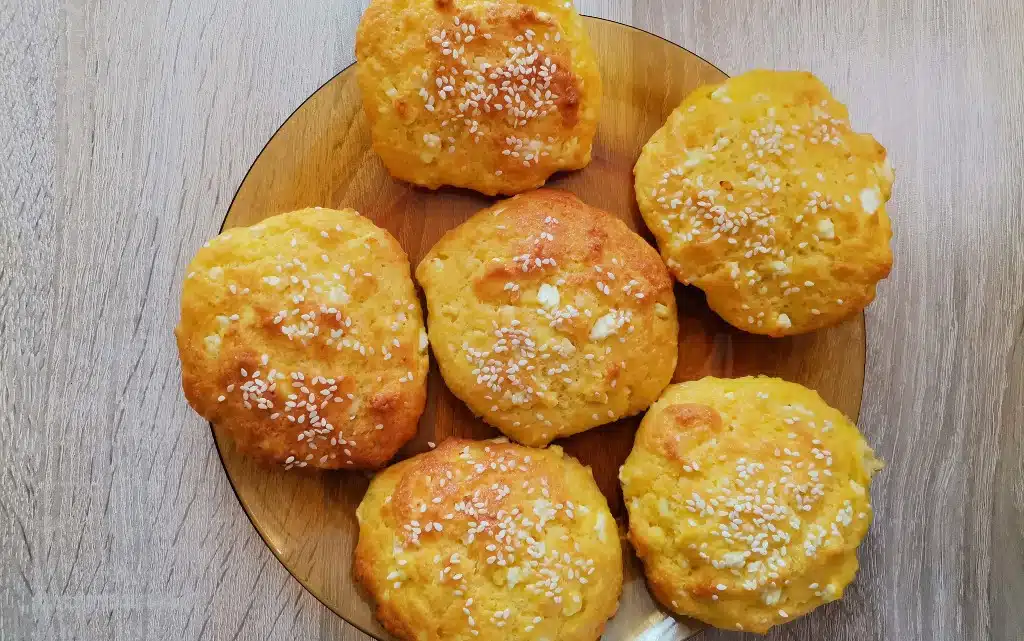 Сипваме всички продукти в купа и разбъркваме добре. Върху хартия за печене оформяме кръгли питки с помощта на лъжица. Поръсваме със сусам. Печем на 180 градуса до готовност. Това е! 🙂