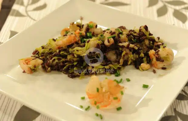 Изцедете черния ориз и го сложете да се запържи. Няколко минути преди да махнете ориза от котлона добавете малките лукчета, нарязани на ситно. Сервирайте черния ориз със скаридите и тиквичките топъл, подправен с малко олио.