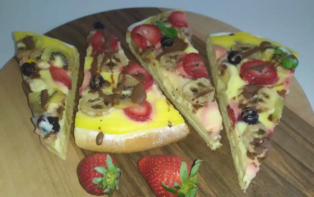Пицата в Италия не винаги е солена, много често тя е просто блат, върху който се гарнират сирена, колбаси и босилек. Понякога може към блата да има сладък крем и плодове и днес ви предлагам да направим такава пица, с която да заместите десерта, а не основното.