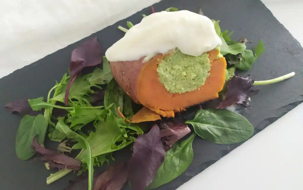 След изпичане сладките картофи се разрязват през средата и се добавя муса от авокадо, а над него и соса. Приятен апетит!