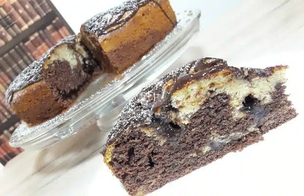 Кексовата смес се разделя на две равни части и към едната от тях се прибавя какаото. Разбърква се отново. Покрива се дъното на тортена форма с падащо дъно с хартия за печене и се разпределят двете смеси, като се редуват.