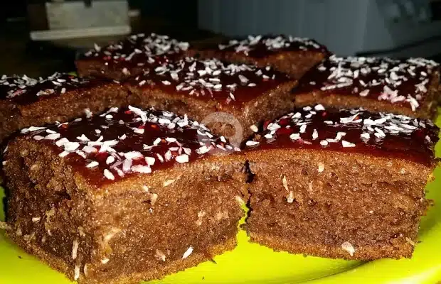 Извадете го и докато е топъл, го намажете с малиновото сладко. Когато се охлади, извадете от тавата, поръсете с кокосови стърготини и нарежете на парчета.