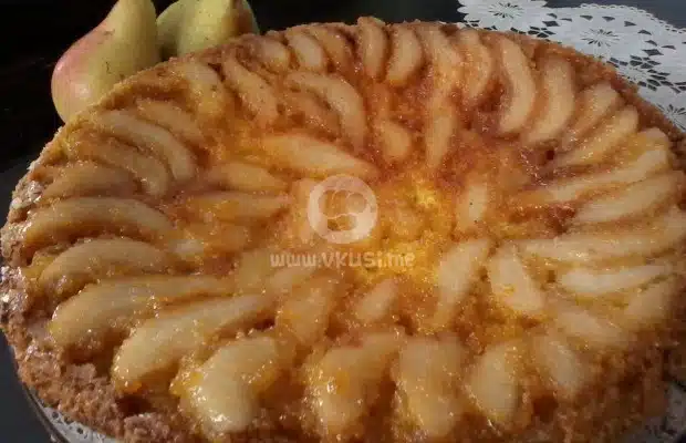 На дъното на тава за печене карамелизираме захарта и отгоре сипваме разтопеното масло. След това нареждаме крушите, които предварително сме нарязали на филии. Заливаме със сместа от яйцата, захарта и брашното с бакпулвера.