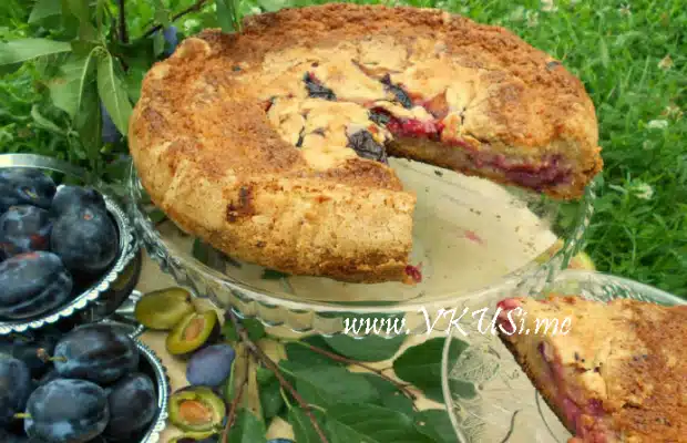 Всичко се разбива отлично, докато се получи хомогенна смес. Тя се изсипва в кръгла голяма тава, покрита с хартия за печене. Върху нея се разпределят нарязаните на четвъртинки пресни сини сливи.