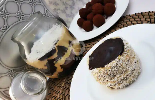 През това време се приготвя кремът както е описано на опаковката. След като блатът изстине, се нарязва на кръгове с помощта на водна чаша. Слепвате два блата с малко крем и внимателно покривате отстрани мини тортичките с още крем. Овалвате в кокосовите стърготини.