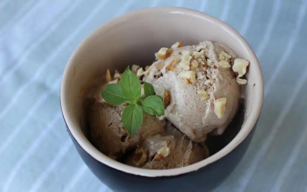 Може да се консумира веднага тъй като се получава като леден крем, а за консистенция на сладолед поставете във фризер за поне 2 часа. Поднесете сладоледа поръсен с орехи или други ядки по избор.