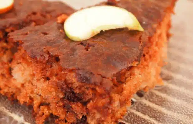 Бакпулверът и содата прибавяме в брашното и го пресяваме. Добавяме го към сместа и разбъркваме добре. Изсипваме сместа за сладкиша в намаслена и поръсена с брашно тавичка. Печем около 30 мин., като опитваме с клечка за зъби дали сладкишът е изпечен.